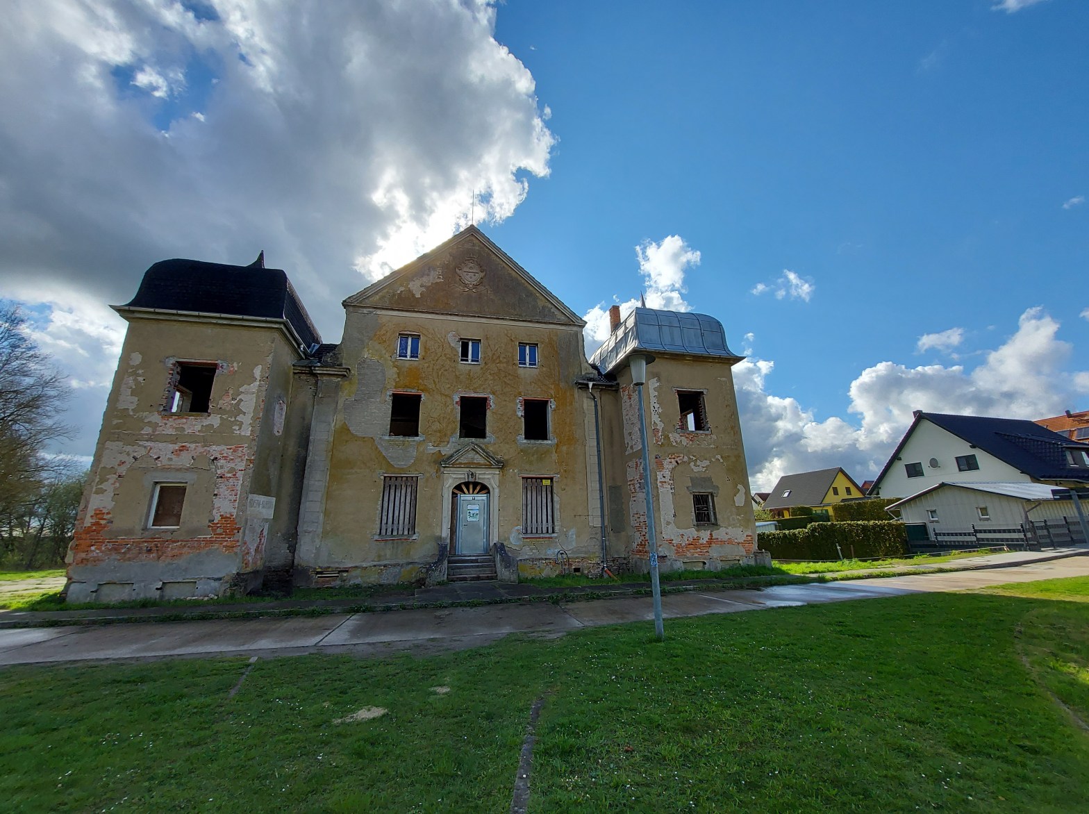 Damit Einwohner und ihre Haustiere nicht unbefugt in das Schloss gelangen, haben wir Sicherungsmaßnahmen durchgeführt. Die Bausubstanz innen ist in einem Zustand, wo es zu erheblichen Verletzungen kommen kann, wenn das Objekt betreten wird.